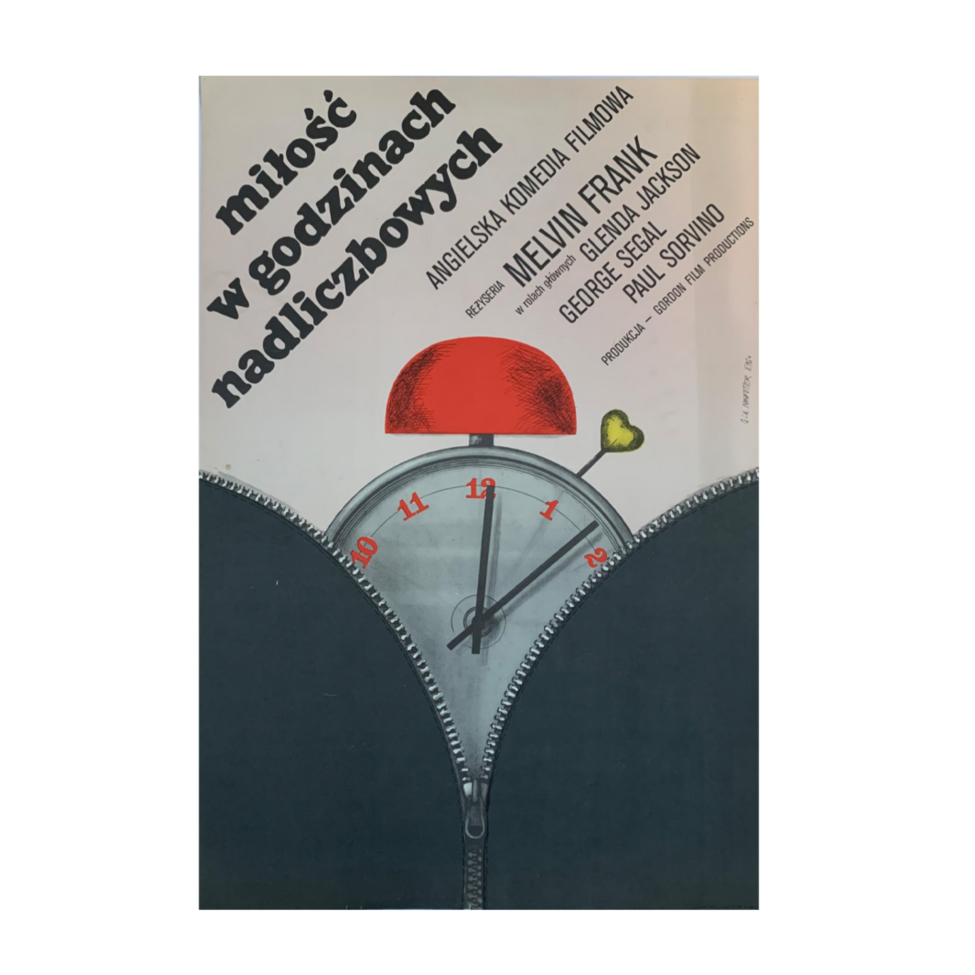 This charming vintage Polish poster was designed by Krzysztof Nasfeter in 1976 to promote the British film ‘Milosc w Godzinach Nadliczbowych’ (A Touch of Class) starring Glenda Jackson and Paul Segal.